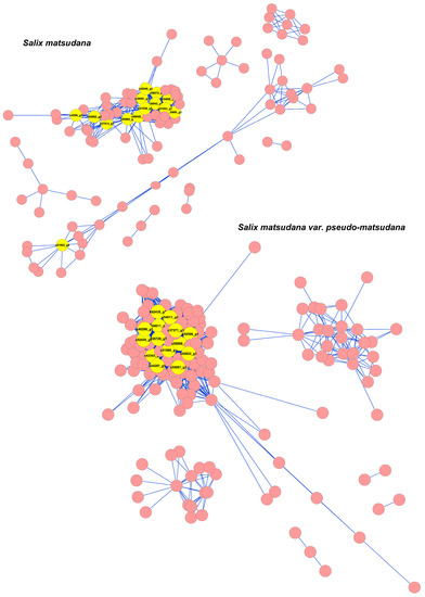 Co-expression networks of hormone-related genes in willow. Each node (circles) represents a gene and edges (connecting lines) between genes represent co-expression correlations. Hub genes are labeled as larger yellow circles. One hundred sixty-seven genes with an edge weight >0.4 were visualized using Cytoscape software.