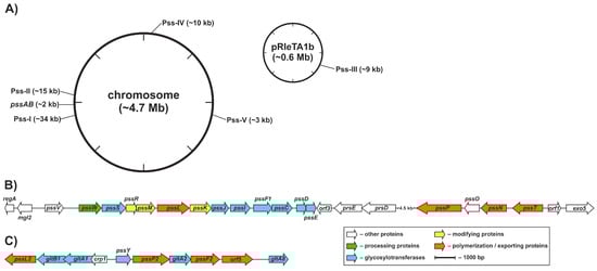 - Król, J.; Wielbo, J.; Mazur, A.; Kopcińska, J.; Lotocka, B.; Golinowski, W.; Skorupska, A. Molecular characterization of pssCDE genes of Rhizobium leguminosarum bv. trifolii strain TA1: PssD mutant is affected in exopolysaccharide synthesis and endocytosis of bacteria. Mol. Plant Microbe Interact 1998, 11, 1142–1148. [Google Scholar] [CrossRef] [PubMed]