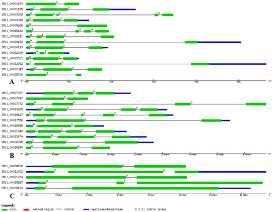 The structural features of each SABATH gene in S. miltiorrhiza. The exons are shown using green rectangles, while black lines connecting two exons represent introns. The numbers above the line represent the intron phase.