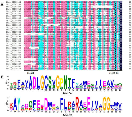 (A) Multiple sequence alignments of the SmSABATH proteins’ conserved domain of O-methyltransferases, including the binding sites (motifs I and III were indicated) of S-adenosyl-l-methionine. (B) Sequence logo of two conserved motifs; motif 4 and motif 2.