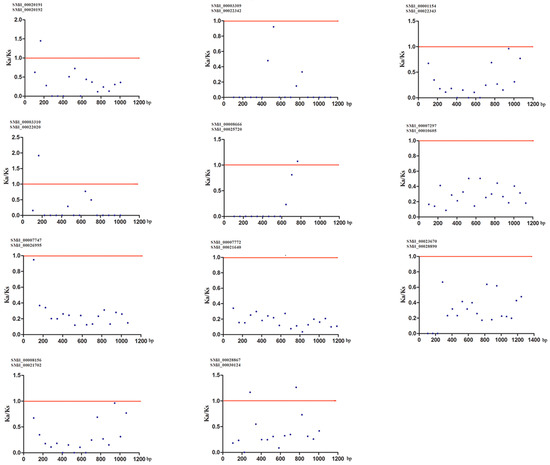 Gene duplication is an important event for gene family expansion and functional diversity during evolution [59]. To detect whether Darwinian positive selection was involved in the driving of gene divergence after duplication, the Ka/Ks ratios of non-synonymous and synonymous substitution rates were calculated using the CDS of paralogous SmSABATH. Generally, a Ka/Ks ratio < 1 indicates a negative or purifying selection, a ratio = 1 indicates a neutral evolution and a ratio > 1 indicates a positive selection [60]. According to the paralogous genes determined from the phylogenetic tree, there were 11 pairs of paralogs in SmSABATH genes (Figure 1). In other words, more than 73% of SmSABATH genes appeared to be duplicated. This suggested that most SmSABATH genes have happened functional diversity and gene family expansion during evolution. The Ka/Ks ratios for all of the 11 SmSABATH paralogous pairs were <1 (Table S6), suggesting that the SmSABATH genes have experienced purifying selection pressure. Meanwhile, we also calculated the Ka/Ks ratios for all of the paralogous genes with a sliding window of 20 aa. The ratios of Ka/Ks that were higher than 1 in the regions of all paralogous genes indicated that these regions had gone through positive selections. However, the proportion of such regions were few. Most of the regions showed that the ratios of Ka/Ks were less than 1 in paralogous genes, and this also indicated that the SABATH genes in S. miltiorrhiza had undergone purifying selection (Figure 4).