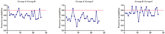 Site-specific prediction for type-I functional divergence between groups of SmSABATH. The X-axis represents the locations of sites. The Y-axis represents the probabilities of each group. The red line indicates a cutoff = 0.80.