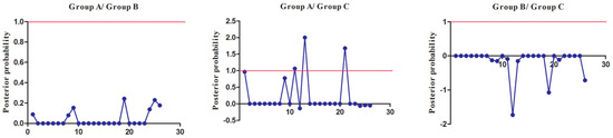Site-specific profile for predicting critical amino acid residues responsible for type-II functional divergence between groups of SmSABATH. The X-axis represents the locations of sites. The Y-axis represents the probabilities of each group. The red line indicates a cutoff = 1.0.