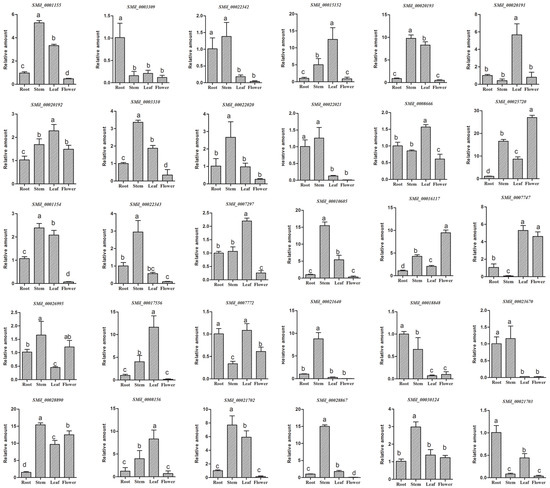 In order to preliminarily detect the tissue-specific expression of the SABATH gene family in S. miltiorrhiza, we analyzed the expression of SmSABATH in the roots, stems, leaves, and flowers of S. miltiorrhiza plants. All of the 30 SmSABATHs that were identified exhibited differential expression patterns (Figure 7). Among the 30 SmSABATHs, three (10.0%) showed predominant expression in roots, seven (23.3%) mainly expressed in leaves, 13 (43.3%) were primarily expressed in stems, and two (6.7%) were in flowers. In addition, five (16.7%) SmSABATHs were mainly expressed in at least two tissues analyzed, indicating that these genes may play a more ubiquitous role in S. miltiorrhiza. On the whole, the SABATH gene family in S. miltiorrhiza was primarily expressed in stems and leaves. This suggested that the SABATH gene family is related to the plant defense against insects that gnaw at the leaves and stems of plants. Once a plant is damaged from the outside environment, the products of SABATH genes, such as methyl jasmonate or methyl salicylate, can enhance the level of plant resistance [11].