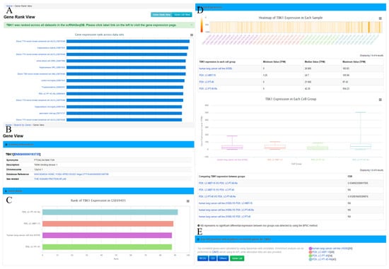 Gene Rank View and Gene View. (A) Gene rank list of an example gene TBK1 across all datasets; (B) Display general information of TBK1 in ‘Gene View’ page; (C) Show the gene rank of TBK1 in each cell group of GSE69405; (D) The section of gene expression displayed by heatmap and box plots. The minimum value, median value, and maximum value of the gene expression and the FDR (false discovery rate) of the gene expression comparison between groups are also displayed; (E) The top 100 positively and negatively correlated genes and annotation links are provided.