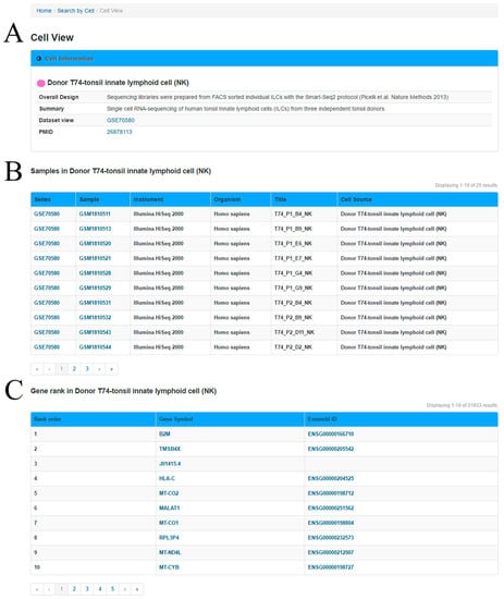 In the ‘Cell View’ webpage (Figure 3), the user can explore the ranked genes in the query cell group and the relationship between two genes in this specific cell group. In the first section, a summary of the cells and experiments are provided based on the metadata of the GEO. In the second section, a table is used to present the information of cell samples in the cell group.