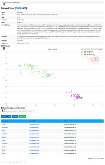 Dataset View, displaying dataset GSE69405 as an example. (A) Metadata information for the dataset; (B) Cell groups and cell cluster are presented; (C) A list of differentially expressed genes between different groups is provided.