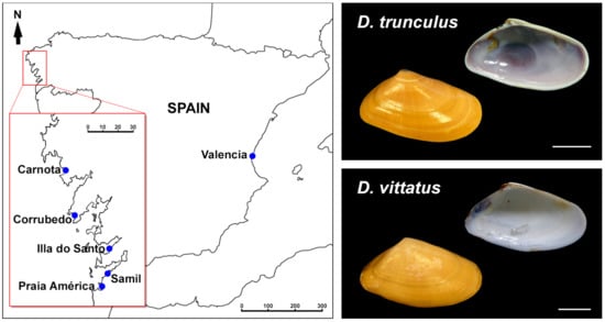 Wedge shells specimens were collected (Figure 1) from exposed beaches in Galicia (northwest Spain). The specimens were identified as the abrupt wedge shell Donax trunculus Linnaeus, 1758, or the banded wedge shell Donax vittatus (da Costa, 1778) according to their shell characteristics. Taking into account the observed differences in the karyotype composition between the Mediterranean [] and Atlantic [] populations of D. trunculus, we also included specimens of the abrupt wedge shell collected in the Gulf of Valencia (east Spain) in our study. In all cases, wedge shells were transported to the laboratory, maintained in tanks of 5 L filtered seawater at 18 ± 1 °C and fed on microalgae to promote somatic growth [,].