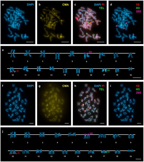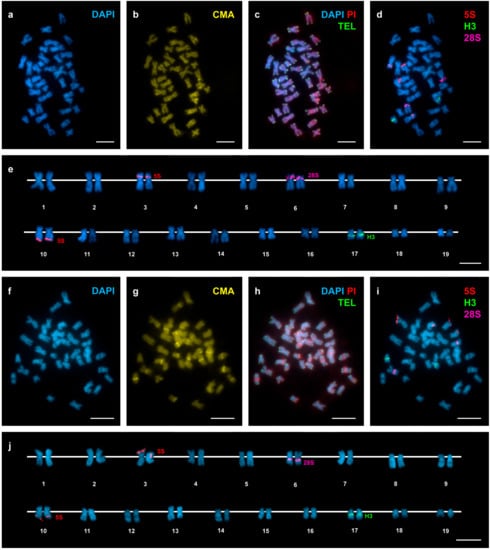 Mapping of telomeric sequence, 5S rDNA, 28S rDNA, and H3 histone gene clusters on Donax vittatus chromosomes. Sequential fluorochrome staining of mitotic metaphase plates shows DAPI-negative regions (a,f) that fluoresce yellow after CMA (b,g) and bright red after DAPI/PI (c, h) staining in Donax vittatus specimens from both Samil (a–c) and all the other Galician (f–h) populations. Hybridization of the same metaphase plates (c,h) with a telomeric PNA probe discloses signals (TEL, green) at both ends of every chromosome. Sequential FISH experiments using major and minor rDNA and H3 histone gene probes on the same metaphase plates (d,i), and the corresponding karyotypes (e,j), show H3 histone gene signals (H3, green) intercalated in the long arms of telocentric chromosome pair 17. Minor rDNA signals (5S, red) are subterminal to the long arms of subtelocentric chromosome pair 10. Major rDNA signals (28S, magenta) overlap the short arms of telocentric chromosome pair 6. Note the presence of 10 telocentric chromosome pairs in specimens from Samil (4, 6, 7, 8, 9, 14, 15, 16, 17 and 18) and 11 in those from the remaining Galician populations (6, 7, 8, 9, 11, 13, 14, 15, 16, 17 and 18). Scale bars, 5 μm.