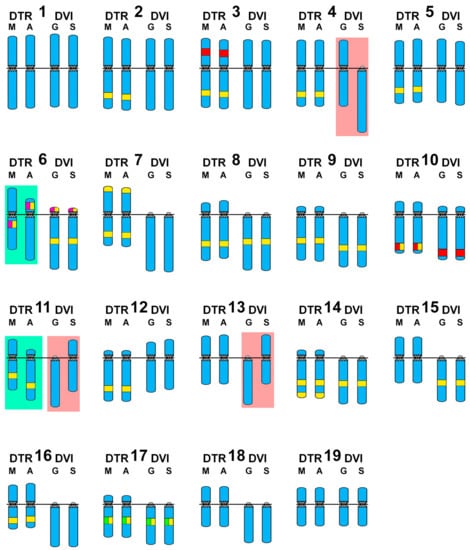 Schematic representation of the wedge shell haploid chromosome complements. For comparative purposes, the schemas of chromosomes 1 to 19 in Donax trunculus (DTR) Mediterranean (M) and Atlantic (A) populations and Donax vittatus (DVI) Galician (G) and Samil (S) populations are represented in quartets. DAPI−/CMA+ bands (yellow), 5S rDNA (red), 45S rDNA (magenta) and H3 histone gene (green) are also represented. The chromosomes showing the most remarkable intraspecific differences are shadowed in light green for Donax trunculus and light pink for Donax vittatus.