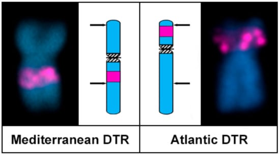 Interspecific karyotype comparison (Figure 4) clearly shows that the telocentric chromosome pair numbers 6, 7, 8, 9, 11, 13, 14, 15, 16, 17, and 18 found in the majority of D. vittatus specimens are bi-armed pairs, being meta and submetacentric (7, 8, 13, 15, 16, 18) or subtelocentric (6, 9, 11, 14, 17), in Atlantic D. trunculus.