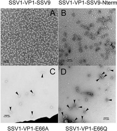 Transmission electron micrographs of SSV1 VP1 mutants. Negatively stained SSV1 mutant virions were imaged using a Tecnai F-20 (FEI) transmission electron microscope operating at 200 keV. The culture supernatant in (Panel A) was concentrated ca. 100 fold with a Vivapsin-500 (10 kDa cutoff) concentrator. (Panel A) Virions from SSV-1 containing the VP1 gene from SSV9; (Panel B) Virions from SSV-1 containing a VP1 gene with the N-terminus of the gene from SSV9; (Panel C) Virions from SSV-1 containing a VP1 gene with the E66A substitution; (Panel D) Virions from SSV-1 containing a VP1 gene with the E66Q substitution. Arrowheads in (Panels C,D) indicate “abnormal” particles.