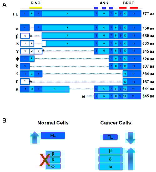 Structure of BRCA1-associated RING domain 1 (BARD1) and spliced isoforms. (A) Full-length (FL) BARD1 exon structure is aligned with spliced BARD1 isoforms below and protein structure above. The protein domains are reported at top of the figure. Splice variants are named with Greek letters (left). Presumed protein coding exons are shown in blue colors; non-coding exons are shown in white (β, κ, γ, η); asterisk shows alternative open reading frames (β, γ and η). Amino acid (aa) number is reported for FL BARD1 and BARD1 isoforms; (B) Model for dual role of BARD1 in cancer. In normal cells BARD1 isoforms (β, δ, ω isoforms, discussed in “Biological Functions of BARD1 as Oncogene” paragraph) are not expressed; in cancer cells, full-length BARD1 (FL) expression (tumor suppressor role of BARD1) decreases and BARD1 isoforms expression (oncogenic role of BARD1) increases. Figure 1 has been modified from Irmgard Irminger-Finger et al. [3].