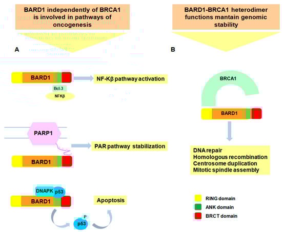 Full-length (FL) BARD1 pathways and functions. FL BARD1 participates in two major pathways as tumor suppressor. (A) BRCA1-independent pathways are mediated by the interaction of BARD1 with proteins involved in oncogenic pathways. BARD1 has transcriptional activity as it can induce the transcription activity of NF-κBs through binding to the NF- κB co-factor BCL3 [68]. FL BARD1 interacts to poly(ADP-ribose) (PAR) after damage and consequently it is recruited to DNA repair [69]. Finally, increased expression levels of FL BARD1 stabilize p53 and facilitate its phosphorylation by DNA-dependent protein kinase (DNAPK) [70,71,72]; (B) BRCA1-dependent pathways are mediated by BARD1-BRCA1 heterodimer. The activity of the BARD1-BRCA1 ubiquitin ligase is implicated in essential functions for maintaining genomic stability [61,62,63,64].