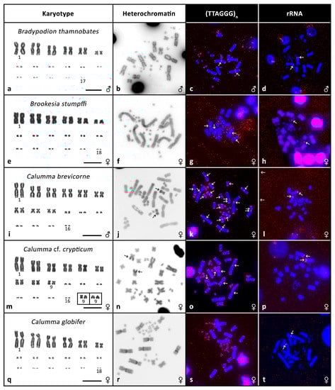 Cytogenetic data. Giemsa stained karyotypes (a,e,i,m,q), C-banding (b,f,j,n,r), fluorescence in situ hybridization (FISH) with telomeric probe (c,g,k,o,s) and FISH with rRNA probe (d,h,l,p,t) in Bradypodion thamnobates, Brookesia stumpffi, Calumma brevicorne, Calumma cf. crypticum, Calumma globifer. Arrows indicate signals.