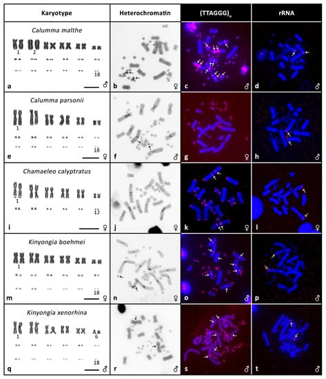 Cytogenetic data. Giemsa stained karyotypes (a,e,i,m,q), C-banding (b,f,j,n,r), FISH with telomeric probe (c,g,k,o,s) and FISH with rRNA probe (d,h,l,p,t) in Calumma malthe, Calumma parsonii, Chamaeleo calyptratus, Kinyongia boehmei, Kinyongia xenorhina. Arrows indicate signals.