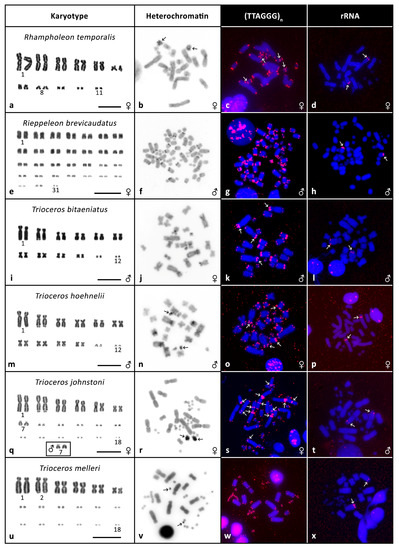 Cytogenetic data. Giemsa stained karyotypes (a,e,i,m,q,u), C-banding (b,f,j,n,r,v), FISH with telomeric probe (c,g,k,o,s,w) and FISH with rRNA probe (d,h,l,p,t,x) in Rhampholeon temporalis, Rieppeleon brevicaudatus, Trioceros bitaeniatus, Trioceros hoehnelii, Trioceros johnstoni, Trioceros melleri. Arrows indicate signals.