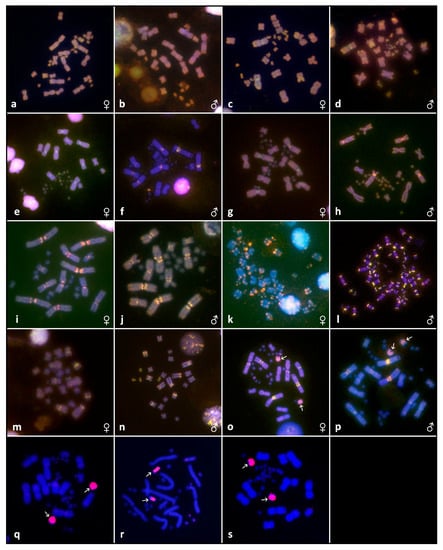 Trioceros johnstoni: the karyotype is composed of 2n = 36 as described previously [33]. There are 14 macrochromosomes out of which 12 are biarmed and 22 microchromosomes (Figure 3q). In pair 7 we observed possible heteromorphy. In the female, it seems that the chromosomes in this pair differ in size while in the male they may differ in morphology (Figure 3q). C-banding revealed heterochromatin in the pericentromeric regions and also strongly in the only acrocentric macrochromosomes—pair 7, in both sexes (Figure 3r). We detected ITS signals in several chromosomal pairs (Figure 3s). FISH with rRNA probe produced a signal in pair 2 (Figure 3t). CGH revealed enrichment of female sequences in chromosome pair 7 in both sexes (Figure 4o,p). Chromosomes from pair 7 were microdissected and hybridised separately to female metaphases and the probes prepared from them displayed a signal in both chromosomes from each pair (Figure 4q,r). The probe prepared from male pair 7 also hybridized to both chromosomes of pair 7 in female metaphase (Figure 4s).