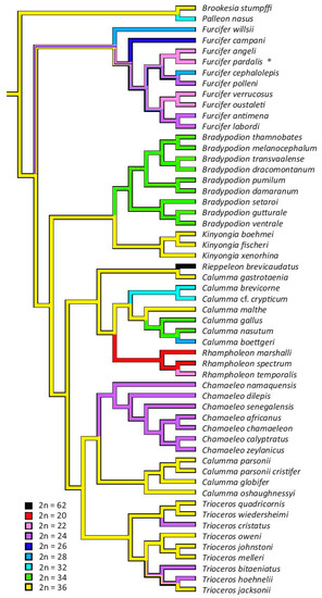 Phylogenetic analysis based on the tree by [32] with depicted number of chromosomes. Results of maximum parsimony analysis reconstructing ancestral chromosome number are visualized by colours of the branches. Asterisk (*) symbolises different chromosome number in female of Furcifer pardalis due to presence of neo-sex chromosomes.