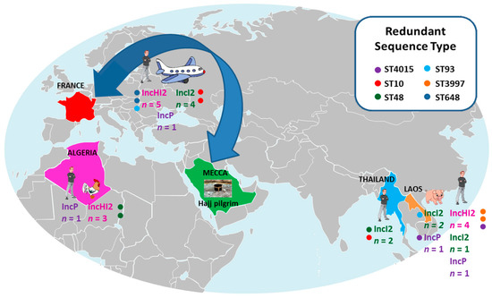 - Leangapichart, T.; Gautret, P.; Brouqui, P.; Memish, Z.A.; Raoult, D.; Rolain, J.-M. Correction for Leangapichart et al., Acquisition of mcr-1 Plasmid-Mediated Colistin Resistance in Escherichia coli and Klebsiella pneumoniae during Hajj 2013 and 2014. Antimicrob. Agents Chemother. 2016, 60, 7537. [Google Scholar] [CrossRef] [PubMed]