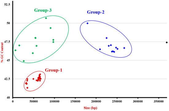Diversity of plasmids carrying the mcr-1 gene. All of these plasmids were retrieved from the NCBI database and were plotted according to their GC% and size. Group-1 includes plasmids from E. coli, C. sakazaki, K. pneumoniae, K. ascorbata, S. enterica, and S. sonnei. The average size and %GC were estimated as 51.88-Kb and 41.32 GC%, respectively. The identified incompatibility plasmid types were IncI2, IncX4. Group-2 includes plasmids from E. coli only. The average size and %GC content were 244.81-Kb and 47.02 %GC, respectively. The incompatibility plasmid types of this group were: IncHI1B, IncHI2, IncFIB, IncN. Group-3 includes plasmids from E. coli, K. pneumoniae, and S. enterica. Their sizes varied from 6. 39 to 97.56-Kb and the GC% content from 44.89 to 50.57%. The incompatibility plasmid types of this group were IncFII, IncX4, IncFIB, IncY. A single plasmid from E. coli (in black) with size of 369.30-Kb, 47.4% of GC content, and belonging to the IncN plasmid type was identified.