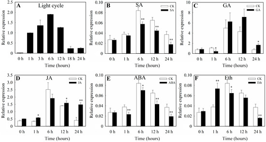Expression profiles of SlbZIP38 in the leaves of Ailsa Craig under exogenous hormone treatments. (A) light cycle treatment; (B) 100 μM salicylic acid (SA) treatment; (C) 100 μM gibberellic acid (GA) treatment; (D) 100 μM jasmonic acid (JA) treatment; (E) 100 μM exogenous abscisic acid (ABA) treatment; (F) 1 mM ethylene (Eth) treatment. CK, the Wild type (WT) plant treated with water which equal volume to hormone serving as the control. Gene expression analyses were examined by RT-qPCR and the expression values were calculated using the 2−ΔΔCt method and normalized to expression of the ELF-α housekeeping gene. Data represent the means ± SE (n = 3). Significantly different values from CK at the * p < 0.05 and ** p < 0.01 level, respectively, as determined by Student’s t-test.