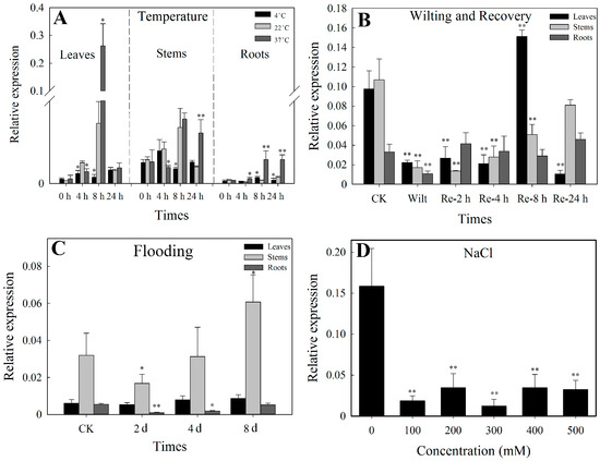 Quantitative Real-time-PCR (qRT-PCR) analysis of SlbZIP38 expression under different abiotic stressors. SlbZIP38 expression in Ailsa Craig tomato plants (A) with exposure to different temperatures; plants under 22 °C serving as the control (CK); (B) wilting and recovery from water stress; CK, samples from untreated plants serving as the control; (C) under flooding; CK, samples from untreated plants serving as the control; and (D) exposure to different concentration of NaCl; Plants under 0 mM NaCl serving as the control. Data represent the means ± SE (n = 3). Significantly different values from the control at the * p < 0.05 and ** p < 0.01 level, respectively, as determined by Student’s t-test.