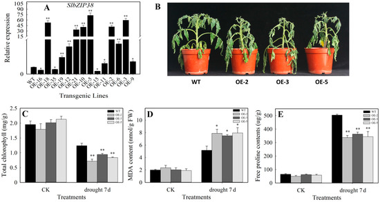 To examine whether SlbZIP38 overexpression conferred resistance to drought stress, one-month-old OE-2, OE-3, OE-5, and WT plants were not watered for seven days. Before stress treatment, no evident phenotypic differences were identified between the transgenic and WT plants. After the drought stress treatment, the transgenic plants showed more severe wilting and shrinking of the leaves than the WT (Figure 4B). Thus, the transgenic plants were more susceptible to drought stress than the WT plants were. The levels of chlorophyll, malondialdehyde (MDA) and free proline are used as an indicator of tolerance to abiotic stresses, such as drought, salinity, and extreme temperatures [49,70,71,72,73]. To evaluate the effects of drought stress on the performance of SlbZIP38-overexpressing transgenic plants, we thus compared the levels of chlorophyll, malondialdehyde (MDA), and free proline in the leaves of OE-2, OE-3, and OE-5 plants under drought stress with those in the WT. Following drought stress, the total chlorophyll content was significantly decreased in all plants examined (Student’s t-test, p < 0.01); this change was more pronounced in the transgenic plants than in the WT (Figure 4C). Before stress, the physiological levels of MDA and free proline were similar between transgenic and WT plants, whereas they were dramatically increased (Student’s t-test, p < 0.05) in the transgenic plants following drought treatment (Figure 4D). The free proline content of SlbZIP38-overexpressing plants was significantly lower (Student’s t-test, p < 0.01) than that of WT plants (Figure 4E). These results suggest that overexpression of the native SlbZIP38 gene may has a negative effect on drought stress tolerance.