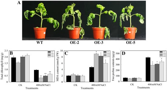 Homozygous transgenic plants OE-2, OE-3, and OE-5 of the T2 generation were subjected to salt tolerance testing with 400 mM NaCl. Whereas the transgenic plants displayed chlorosis and leaf fall after treatment with 400 mM NaCl, the WT plants were more resistant to salt stress (Figure 5A). We also measured the levels of chlorophyll, MDA, and free proline in plants subjected to salt stress. In contrast to our observations for the drought treatment, the levels of chlorophyll and free proline exhibited a greater decline (Student’s t-test, p < 0.01 or p < 0.05) in the transgenic plants than in the WT plants after salt treatment (Figure 5B,D), but the levels of MDA had significantly increased (Student’s t-test, p < 0.05) (Figure 4). These results suggest that overexpression of the native SlbZIP38 gene reduces salt stress tolerance.