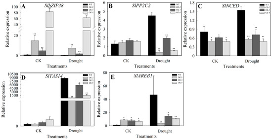 Relative mRNA transcript levels of SlbZIP38 and ABA-responsive genes in WT and SlbZIP38-overexpressing lines under control and drought stress conditions. (A) SlbZIP38, (B) SIPP2C2, (C) SlNCED, (D) SITAS14, (E) SlAREB1. One-month-old WT and SlbZIP38-overexpressing plants were grown under drought conditions for seven days. The leaves were harvested and total RNA was isolated and subjected to RT-qPCR analysis. CK, samples from untreated plants serving as the control. Data represent the means ± SE (n = 3). Significantly different values from WT at * p < 0.05 and ** p < 0.01 level, respectively, as determined by Student’s t-test.