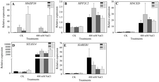 The relative mRNA transcript levels of SlbZIP38 and ABA-responsive genes in WT and SlbZIP38-overexpressing lines in response to salt stress. (A) SlbZIP38, (B) SIPP2C2, (C) SlNCED, (D) SITAS14, (E) SlAREB1. One-month-old WT and SlbZIP38-overexpressing plants were treated with 400 mM NaCl for five days. The leaves were harvested and total RNA was isolated and subjected to RT-qPCR analysis. CK, samples from untreated plants serving as the control. Data represent the means ± SE (n = 3). Significantly different values from WT at * p < 0.05 and ** p < 0.01 level, respectively, as determined by Student’s t-test.