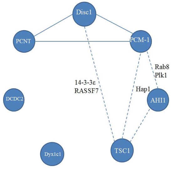 | PCNT | interacts with proteins involved in cilia assembly | pericentriolar matrix assembly, anchors the γ-tubulin complex to the centrosome, providing microtubule nucleation sites | dyslexia schizophrenia | functioning of the centrosomes and the cytoskeleton, interneuron migration | [59,60,61] | |