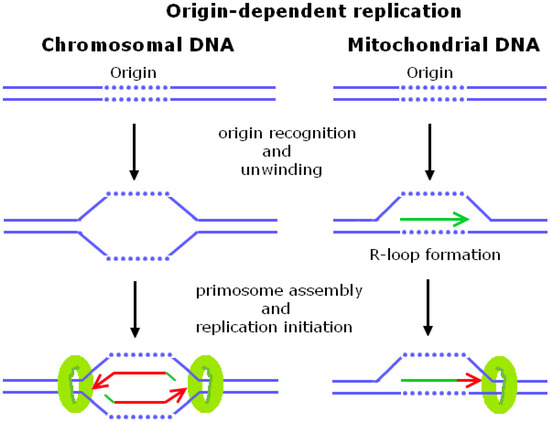 Schematic outline of origin-dependent initiation of chromosomal and mitochondrial DNA replication. cis-acting origin DNA sequences (dotted lines), RNA (green), newly synthesized DNA (red), and helicases (green circle) are indicated. Note that chromosomal origin unwinding is driven by protein–DNA interactions, while transcription-dependent R-loop formation is a key step in mitochondrial origin-unwinding. See text for more details.
