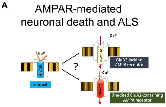 In the spinal motor neurons of most patients with sporadic ALS, RNA editing of GluA2 is inefficient at the Q/R site, and abnormal Q/R site-unedited GluA2 (GluA2Q) is expressed in approximately half of the patients’ remaining motor neurons [13,14,15]. AMPA receptors are either Ca2+-permeable or -impermeable; this is determined based on whether the AMPA receptor has GluA2R in its subunit assembly. Only the AMPA receptors with GluA2R are Ca2+-impermeable, whereas those composed of only Q/R site-unedited subunits, including GluA2Q, are Ca2+-permeable [34]. When unedited GluA2 (GluA2Q) is expressed in the motor neurons, AMPA receptors are abnormally Ca2+-permeable increasing motor neurons death in conditional ADAR2 knockout mice (AR2) (Figure 3C) [22].