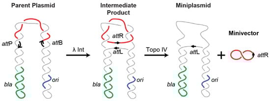 Multiple recombinase systems have been used to generate minicircles, including phage λ integrase, phiC31 recombinase, Flp recombinase, ParA resolvase, and Cre recombinase (reviewed in [9,18]). In the miniplasmid systems mentioned in Section 3, the miniplasmids are, themselves, the gene therapy vector (because only antibiotic sequences were removed from them), whereas here they are discarded because they contain everything except the sequence of interest. In both cases, miniplasmids encode ori, and are therefore still referred to as plasmids.