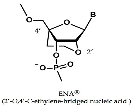 - Morita, K.; Hasegawa, C.; Kaneko, M.; Tsutsumi, S.; Sone, J.; Ishikawa, T.; Imanishi, T.; Koizumi, M. 2′-O,4′-C-ethylene-bridged nucleic acids (ENA): Highly nuclease-resistant and thermodynamically stable oligonucleotides for antisense drug. Bioorg. Med. Chem. Lett. 2002, 12, 73–76. [Google Scholar] [CrossRef]