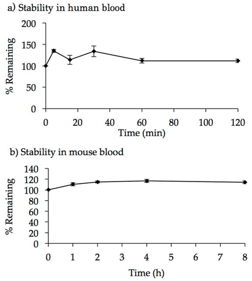 Stability of AO85 in human and mouse blood. Human blood was collected from three healthy volunteers, who had received no drugs for more than one week before blood sampling, with written informed consent. A 5 μL aliquot of AO85 solution (1.0 mg/mL) was added to the freshly obtained human individual blood (2.5 mL each, n = 3) at a final concentration of 2.0 μg/mL. Aliquots of the blood incubation mixture were taken at the time points of 0, 5, 15, 30, 60, and 120 min after incubation at 37 °C. Mouse blood was obtained from male mice (C57BL/6NCrlCrlj, n = 42, Charles River Laboratories, Yokohama, Japan) under isoflurane anesthesia. A 20 μL aliquot of AO85 solution (1.0 mg/mL) was added to the freshly obtained pooled mouse blood (10 mL) at a final concentration of 2.0 μg/mL, which was divided into three portions prior to incubation. Aliquots of the blood incubation mixture were taken at the time points of 0, 1, 2, 4, and 8 h after incubation at 37 °C. An aliquot (100 μL) of each blood sample following centrifugation at 15,000 rpm at 4 °C for 5 min was mixed with 100 μL aqueous methanol containing an internal standard (IS) compound, followed by filtration using the Amicon Ultra filter (YM-50) and concentration using the Amicon Ultra filter device (YM-3). The samples were analyzed by LC-MS/MS system (HPLC: Ultimate, MS: TSQ Vantage, Thermo Fisher Scientific Inc., Waltham, MA, USA), and peak area ratio (AO85/IS) was determined. Then, the data at each time point were expressed as stability %, with peak area ratio at 0 min being 100%. (a) Stability is shown as % remaining at each time point. In human blood, the peak area ratio of AO85/IS remained stable even for 120 min; (b) In mouse blood, the peak area ratio of AO85/IS remained stable even for 8 h.