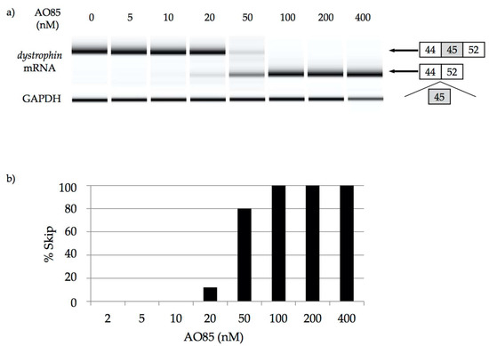 Induction of exon 45 skipping with AO85 in Duchenne muscular dystrophy (DMD) myotubes. Preparation of myotubes from a DMD patient with a deletion mutation of exons 46–51 and examination of exon skipping by AO85 transfection were conducted as described previously [32]. AO85 was added into cultured medium at concentrations of 0, 5, 10, 20, 50, 100, 200, and 400 nM. cDNA was prepared from 1 μg of total RNA. The dystrophin mRNA was analyzed by RT-PCR amplification. (a) The result of RT-PCR amplification. At the concentration over 20 nM, RT-PCR amplification revealed shorter product lacking exon 45, which was not observed at the concentration lower than 10 nM. Only shorter product was observed at the concentration over 100 nM; (b) The exon-45-skipping efficacy by AO85. Skipping efficiencies were determined from gel images by quantifying the skipped products with a DNA 1000 LabChip Kit on an Agilent 2100 Bioanalyzer (Agilent Technologies, Santa Clara, CA, USA). At the concentration over 100 nM, 100% of the dystrophin mRNA showed exon 45 skipping.