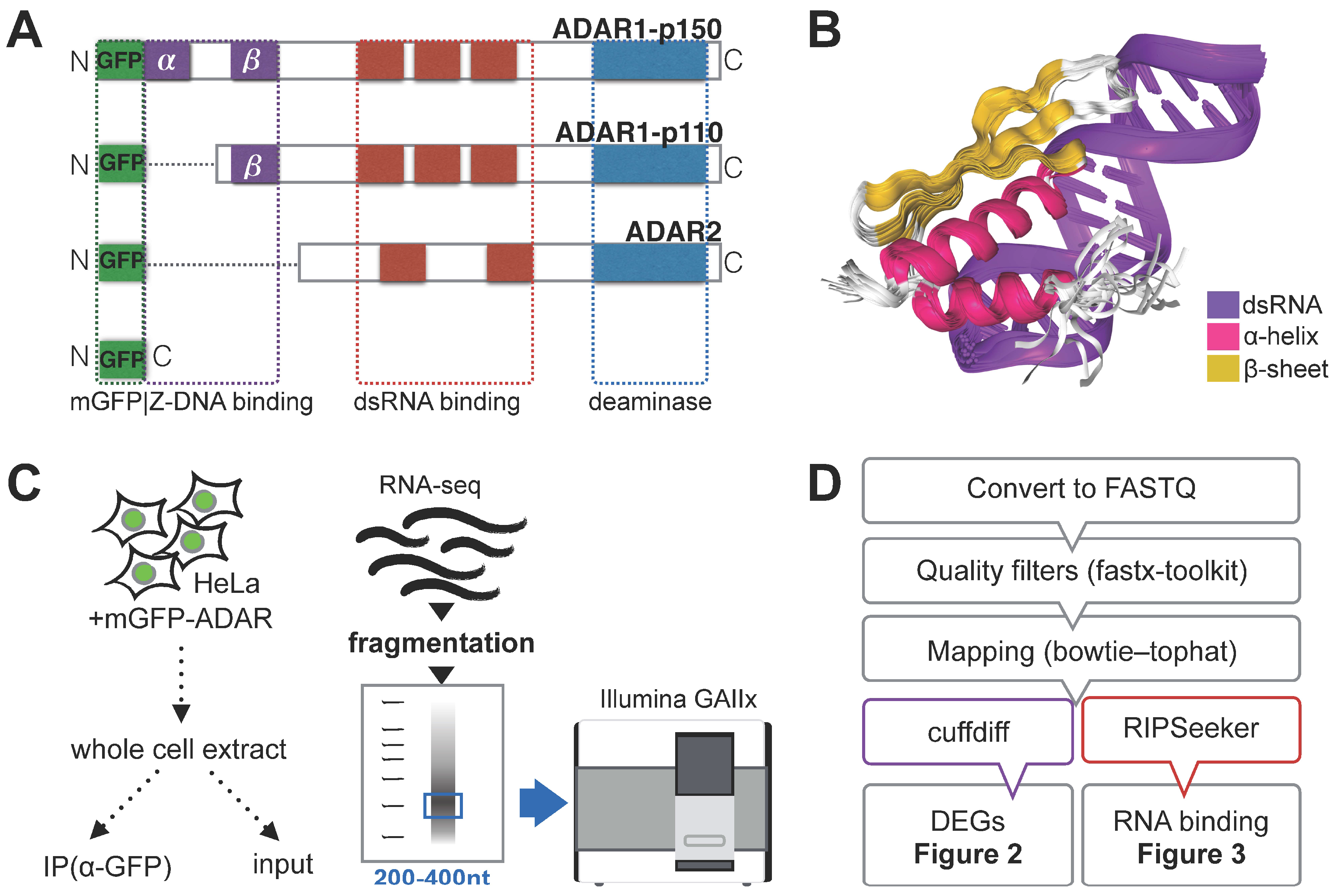 Experimental and computational workflow for RNA immunoprecipitation (RIP)-sequencing. (A) Schematic representation of known domains within adenosine deaminase acting on RNA (ADAR) enzyme isoforms with a catalytically-active deaminase domain. The final fusion proteins used in this experiment all harbor myc-green fluorescent protein (GFP) (mGFP) in the N-terminal region (left side in this figure). The dots within the protein sequence do not represent any real protein sequence, they were added in order to align and visually compare similar domains. Purple: Z-DNA binding domains; red: double-stranded RNA (dsRNA)-binding domains; blue: deaminase domain; green: mGFP; (B) the crystal structure of ADAR2 dsRNA-binding domain dsRBM1 bound to the free gluR-B R/G lower stem-loop (LSL) RNA rendered from PDB accession number (23LC). Different types of structures are represented in separate colors; (C) the experimental workflow for RIP-seq. HeLa cells are transfected with expression vectors for each mGFP-ADAR fusion protein. Part of the whole cell lysate was used for IP using anti-GFP antibody attached to magnetic beads, while the other part was used as a control (input). RNA was fragmented and material sized 200–400 nt was selected by gel electrophoresis and subjected to library preparation using mRNA-Seq Sample Prep Kit for Illumina GAIIx; and (D) the custom computational workflow used to obtain the results presented in this paper: differentially-expressed genes (DEGs) and ADAR-bound RNA targets.