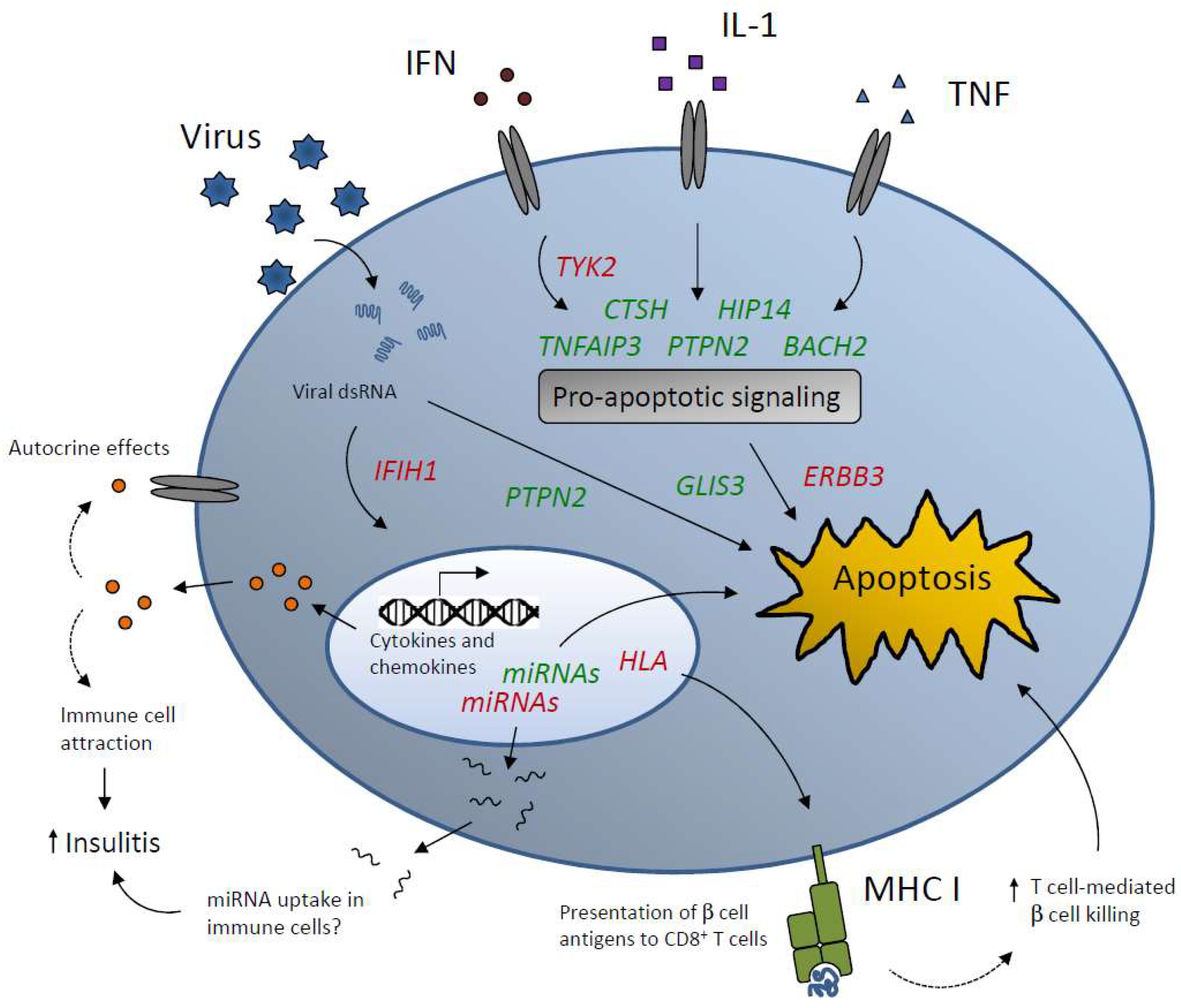 A number of type 1 diabetes (T1D) candidate genes are known to modulate β-cell apoptosis, viral infection, and islet inflammation. Genes marked in green and red designate protective and deleterious roles in the β-cell, respectively. Some of the T1D risk genes including HIP14, TNFAIP3, TYK2, and CTSH are regulators of cytokine effects at the level of pro-apoptotic signal transduction. Other genes such as IFIH1 and PTPN2 are involved in the cellular responses to viral double stranded RNA (dsRNA). Downstream signaling events include alterations in expression and secretion of inflammatory cytokines and chemokines that may exert detrimental autocrine effects and/or attract immune cells, thereby amplifying insulitis. Secreted micro RNAs (miRNAs) from β-cells may also increase islet inflammation and β-cell damage by modulating immune cell activity. Finally, genetic variants in HLA genes may cause β-cell hyperexpression of major histocompatibility complex (MHC) I presenting β-cell (neo)epitopes to cytotoxic T cells.