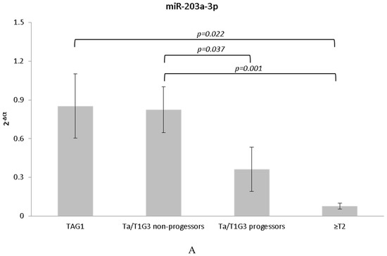 The Cox proportional hazards model was used to investigate whether or not a significant change in specific miRNA expression levels corresponded with time to progress to muscle invasive disease. Multivariate Cox regression analysis of 35 miRNAs showed two miRNAs, miR-205-5p and miR-203a-3p that were significantly associated with time to progression (miR-205-5p: hazard ratio (HR), 0.789; p = 0.014; miR-203: HR, 0.854; p = 0.027). Both of these miRNAs were found to be downregulated in the progressor group and for each two-fold increase in the miRNA levels, instantaneous risk of progression decreases by 21% and 15% for miR-205-5p and miR-203a-3p, respectively.