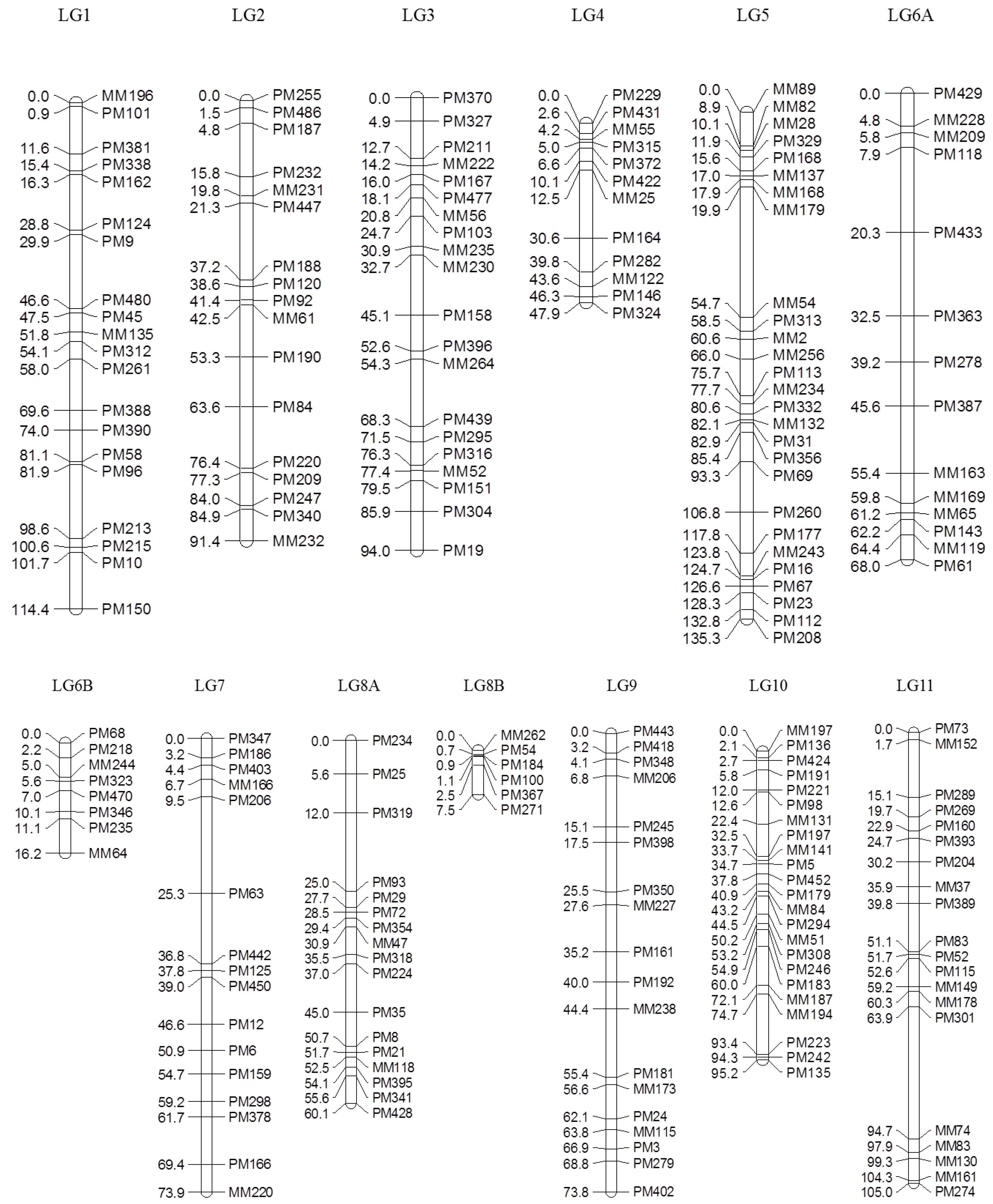 Table 2). There was an average of 16.8 markers per linkage group with the highest number (27) observed in LG5, followed by LG10 (23). Overall, the average distance between two neighbouring markers across all linkage groups was 4.2 cM, after the spaced map was created. The longest interval between markers was 34.8 cM in LG5 between MM179 (19.9 cM) and MM54 (54.7 cM). An average map length of 75.6 cM was calculated across all 13 linkage groups. LG5 appeared to be the longest linkage group and covered 135.3 cM with 27 GEMs, followed by LG1 (114.4 cM) and LG11 (105.0 cM;