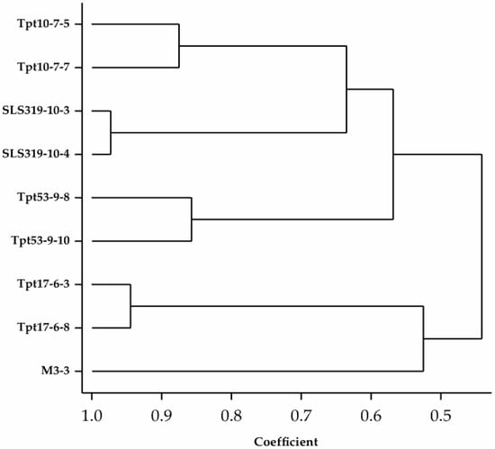 A dendrogram of the genetic relationship between genotypes from Papua New Guinea (Tpt10), Sri Lanka (SLS319), Bangladesh (Tpt53), Indonesia (Tpt17), and Malaysia (M3).