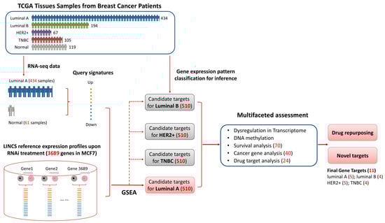 The following are available online at www.mdpi.com/2073-4425/8/3/86/s1. Table S1: This table gives the detailed clinical information of 434 luminal A samples for TCGA breast cancer, Table S2: This table gives the detailed information of LINCS MCF7 RNAi experiments data and control untreated data, Table S3: This table gives the differential expression analysis result of limma for luminal subtype A, Table S4: KEGG pathway analysis result of luminal A signature genes with DAVID, Table S5: This sheet contains luminal A signature for GSEA calculation, i.e., top 250 up- and down-regulated genes for luminal A subtype, Table S6: Functional classification of 510 candidate genes with PANTHER, Table S7: Transcriptome analysis of 510 candidate genes for TNBC, Table S8: Information of 70 survival related genes for TNBC, Table S9: This sheet contains methylation analysis result for TNBC (gene centric), Table S10: This sheet contains DrugBank drugs which target the 70 survival related genes predicted with our pipeline, Table S11: Final candidate targets for HER2+, Figure S1: Hierarchical clustering result of 919 breast samples (434 luminal A, 194 luminal B, 67 HER2+, 105 TNBC and 119 normal tissue) using 500 luminal A specific signature, Figure S2: Hierarchical clustering result of 434 luminal A breast samples and corresponding normal samples using 1000 most-variable genes as determined by variation, Figure S3: Hierarchical clustering result of luminal B breast samples and corresponding normal samples using 1000 most-variable genes as determined by variation, Figure S4: Hierarchical clustering result of HER2+ breast samples and corresponding normal samples using 1000 most-variable genes as determined by variation, Figure S5: Hierarchical clustering result of TNBC samples and corresponding normal samples using 1000 most-variable genes as determined by variation, Figure S6: Distribution of logFC (log2-fold change) values of 510 candidate genes in transcriptome of (A) Luminal A, (B) Luminal B, (C) HER2+, (D) TNBC breast tumor samples, Figure S7: Kaplan–Meier curve of selected genes (A) MCU1 with p value 0.018 and HR 2.06. (B) TIAM1 with p value 0.022 and HR 1.57, Figure S8: Bimodal distribution of the calculated beta values, with two peaks around 0.1 and 0.9 and a relatively flat valley around 0.2–0.8, Figure S9: Venn diagram of final candidate gene targets for four breast cancer subtypes.