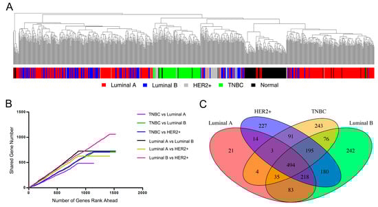 (A) Hierarchical clustering dendrogram of 919 breast samples (434 luminal A, 194 luminal B, 67 HER2+, 105 TNBC and 119 normal tissue) using 1000 most-variable genes as determined by variation; (B) Overlapping number of top ranking differentially expressed genes between any two cancer subtypes; (C) Venn diagram of differentially expressed genes for four subtypes.