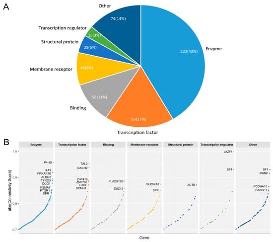 (A) Functional classes of protein products from the 510 candidate genes. Enzymes (predominantly kinases) and transcription factors constitute over half the candidate genes. A total of 14% of proteins, here labelled “Other”, fall into classes including transporters, cytokines, splicing factors, kinase activator, etc.; (B) Absolute connectivity score of candidate genes in each functional group. Genes with absolute connectivity score above 0.85 are labeled with gene symbols.