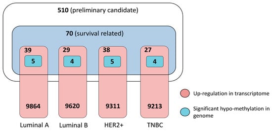 DNA methylation of tumor suppressor genes has been the focus of numerous studies that have aimed to identify DNA methylation biomarkers of cancer [53]. Meanwhile, it is becoming clear that hypomethylation is equally important a driving force in breast cancer metastasis [54,55]. Thus, we further investigated DNA methylation status of the 23,423 genes in tumor samples of each breast cancer subtype, with the aim to identify genes that undergo significantly differential methylation at cancer state. Using TCGA methylation data generated from Illumina HumanMethylation450 BeadChip platform, we performed differential methylation analysis for 288 luminal A, 127 luminal B, 31 HER2+, and 59 TNBC tumor samples as well as 87 normal breast tissue samples. We observed a bimodal distribution of the calculated beta values, with two peaks around 0.1 and 0.9 and a relatively flat valley around 0.2–0.8 (Supplementary Materials Figure S8). In differential methylation analysis, Beta-value has a more intuitive biological interpretation, but the M-value is more statistically valid for the differential analysis of methylation levels [56]. As recommended, we used M-value to calculate differential methylation positions (DMPs) with limma. The number of normal samples was 33 for luminal A, 18 for luminal B, 6 for HER2+ and 5 for TNBC, respectively. Probes with FDR value less than 0.05 and an average Beta-value difference of 0.2 between cancer and normal samples were considered as differentially methylated probes (Supplementary Materials Table S9).