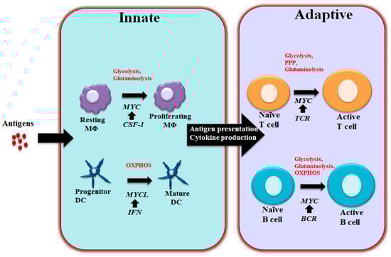 Immune response is an evolutionarily conserved process that protects multicellular organism from pathogens. The immune system is comprised of a variety of cells and molecules that are capable of identifying and eliminating foreign invaders, but not of self-tissue molecules. In order to do that, they have a powerful capability for learning, memory, and pattern recognition [,,]. The immune responses to foreign antigens rely on both innate and adaptive immune components. The innate immune response is largely mediated by macrophages, dendritic cells, natural killer cells, monocytes, neutrophils, complement proteins, act together in a dynamic network to provide immediate host defense. Adaptive immune response consists of antigen-specific reactions through the proliferative burst and functional polarization of T lymphocytes and B lymphocytes. Innate immune response is rapid and short, but sometimes damages normal tissues through lack of specificity, whereas the adaptive response is long and precise, and takes several days to develop. The invading pathogens of vertebrates often rapidly reproduce and spread. As an essential transcription factor, MYC regulates numerous genes in both innate and adaptive immune cells and directs their activation, proliferation, polarization, and subsequent functional events elicited by these cells (Figure 1).