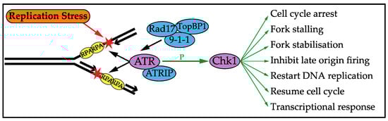 In order to tolerate DNA replication stress, the cell has evolved a checkpoint response, conserved from yeast to man, which prevents DNA damage and genome instability []. The checkpoint response is triggered by the extended lengths of ssDNA exposed during replication stress, likely due to continued helicase action once the polymerase has stalled []. The cellular response to DNA replication stress has been extensively reviewed previously [,,,,,,,,]. ssDNA is bound by a ssDNA binding protein, which protects vulnerable ssDNA and recruits the checkpoint sensor kinase; in mammalian cells these proteins are Replication Protein A (RPA) and ATR (Ataxia Telangiectasia and Rad3-related protein), respectively [,,]. ATRIP (ATR Interacting Protein) is recruited with ATR []. Rad17 is also recruited, which loads the 9-1-1 complex, which recruits TopBP1 to fully activate ATR [,,]. ATR is a serine/threonine kinase of the PI-3-like kinase family that phosphorylates, among other targets, the checkpoint effector kinase Chk1 [,], as summarised in Figure 1. Replication stress primarily induces this ATR-Chk1 pathway, whilst the response to DNA DSBs mainly depends on ATM-Chk2 signalling. However, crosstalk between the two pathways is seen and ATR and Chk1 can have distinct and independent roles in the DNA replication stress checkpoint response [,,]. Once activated, Chk1 phosphorylates a wide range of targets, altering their level and activity, thereby activating the checkpoint functions discussed below.