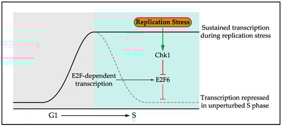 The role of post-translational modifications in regulating and coordinating the response to DNA replication stress has been widely studied [,]. Phosphorylation is a key element of the checkpoint response through ATR and Chk1 kinase activity, but ubiquitination and sumolation are also important []. However, until recently the role of transcription in the Replication Stress Response (RSR) was largely unknown. Initially the response to replication stress, including the transcriptional response, was considered together with the response to DNA damage and collectively named the DNA Damage Response (DDR). However, it has become increasingly clear that these represent independent responses, in signalling, function and outcome, prompting the authors in a recent review to use the subheading “The RSR: time to fly solo from the DDR” []. In line with this, work carried out in the fission yeast Schizosaccharomyces pombe established a transcriptional response that is specific to replication stress. This work showed that G1/S cell-cycle-regulated transcription is maintained in response to replication stress [,,,,,]. Interestingly, this is a specific function in the response to replication stress as G1/S transcription is instead inactivated in response to DNA damage, in a checkpoint-dependent manner [,]. Subsequent work in the budding yeast Saccharomyces cerevisiae [,] and human cells [] established that this transcriptional response to replication stress is conserved from yeast to man []. G1/S transcription is a wave of transcription encoding many components required in S phase, such as those required for DNA replication and repair. Activation of G1/S transcription in G1 phase drives cell cycle entry and transcription is subsequently repressed upon S phase entry. G1/S transcription encodes its own repressor, setting up a negative feedback loop to turn off transcription [,]. In response to DNA replication stress, G1/S cell cycle transcription is maintained through the checkpoint-dependent phosphorylation and inhibition of this repressor, Nrm1 in yeast and E2F6 in mammalian cells [,,,,], Figure 2.
